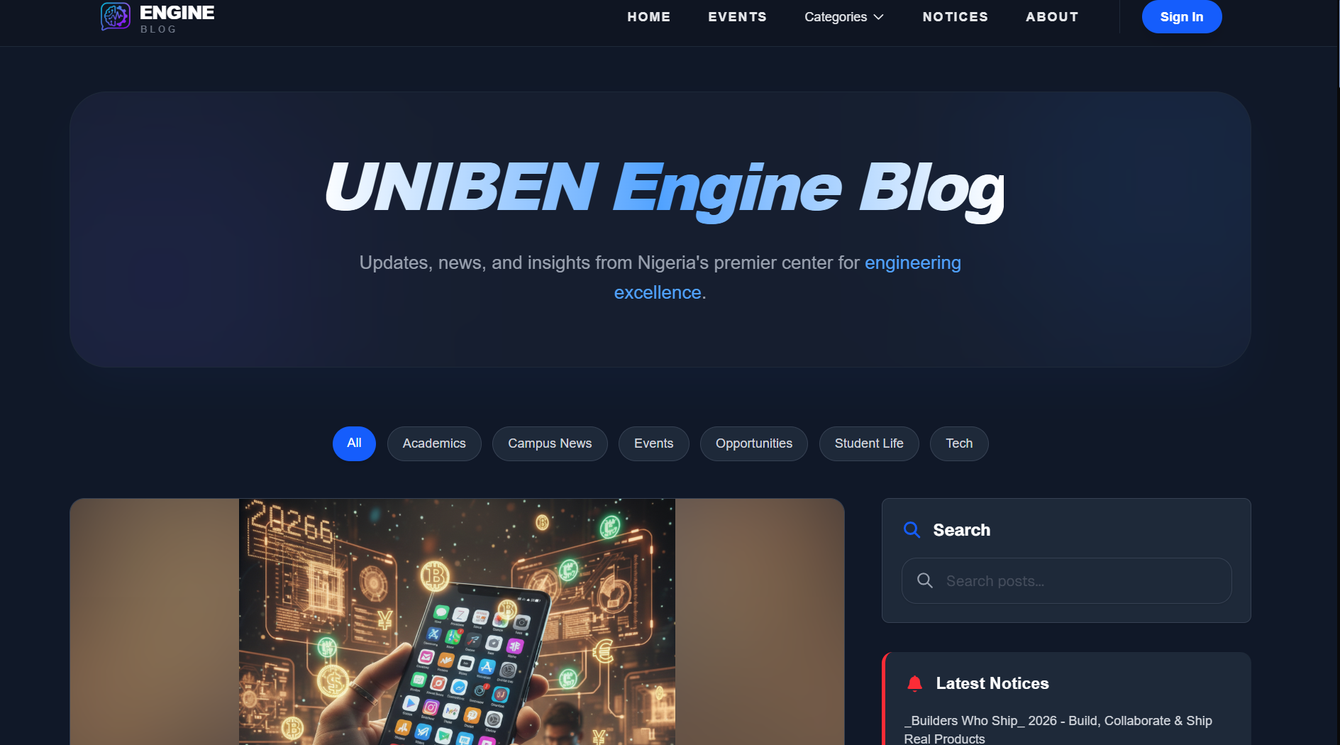 Engine Blog is a modern, dynamic web platform designed to keep engineering students updated with campus news, academic resources, and opportunities. Built with a focus on speed, aesthetics, and user experience.