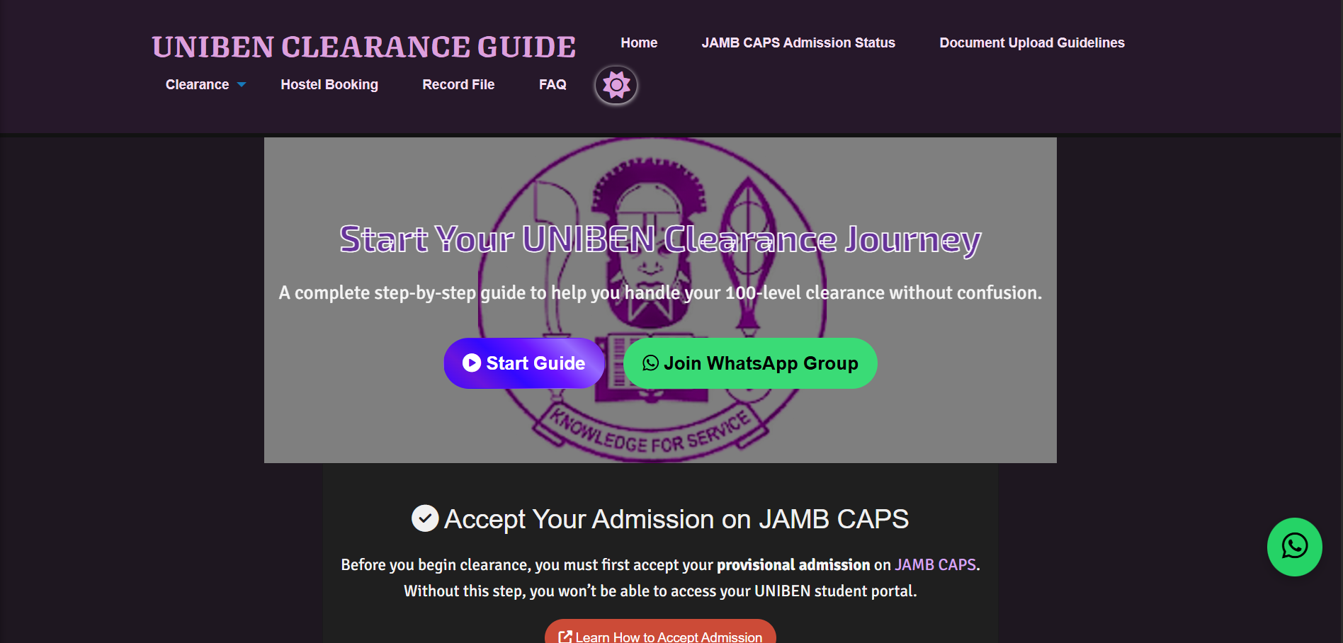 Web platform designed to assist 100-level UNIBEN students with the clearance process, offering user-friendly navigation, responsive design, and simplified administrative steps.